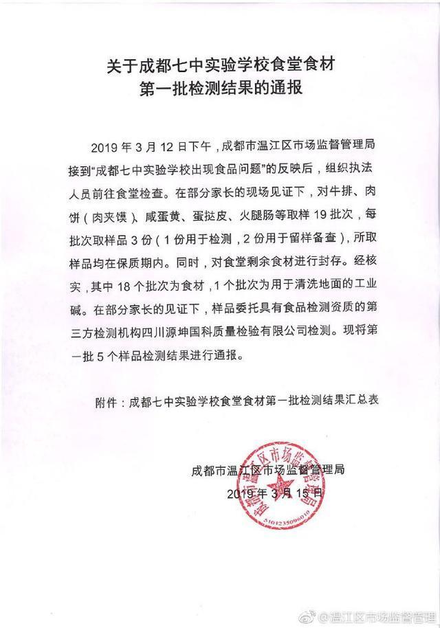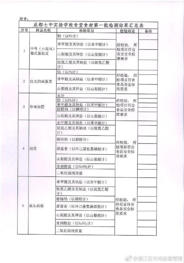 四川發(fā)布客戶端消息 今天下午,溫江區(qū)市場監(jiān)督管理局官微@溫江區(qū)市場監(jiān)督管理 發(fā)布關于成都七中實驗學校食堂食材第一批檢測結果的通報。通報中表示,所取樣品均在保質期內。
