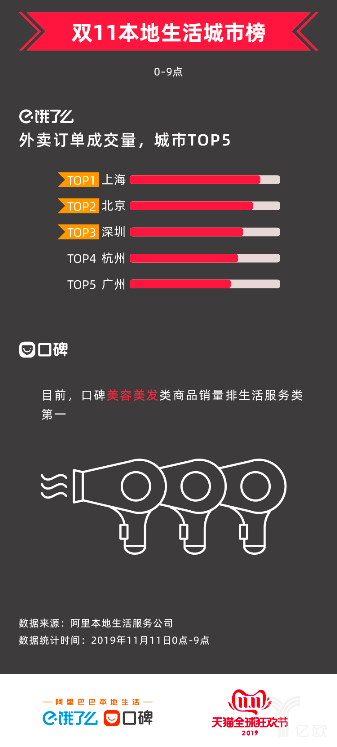 截至11日上午9:00,星巴克在餓了么雙11“飯票”榜上排名第一,上海、北京、深圳、杭州、廣州位居餓了么外賣訂單量前五名??诒瓵PP上,美容美發(fā)類商品銷量在生活服務(wù)類中位居前列。