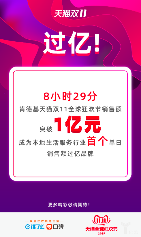 2019年11月11日,口碑餓了么透露,當(dāng)日上午8:29分,肯德基在2019天貓雙11全球狂歡節(jié)上的銷售額正式突破1億元。這是我國本地生活行業(yè)首個單日銷售額過億的品牌。