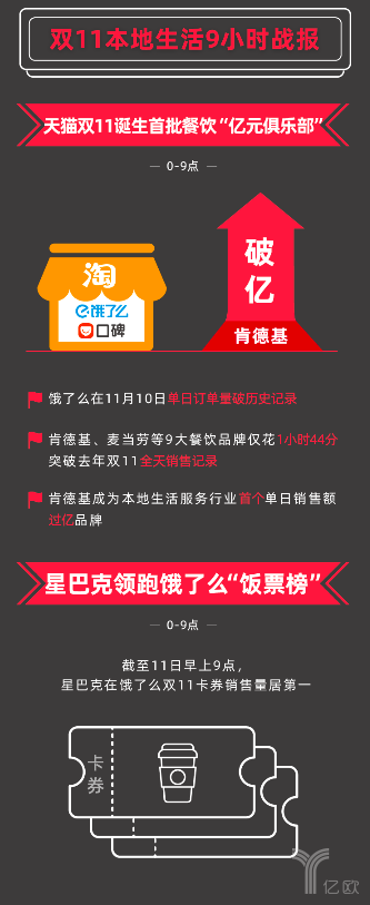 另外,天貓雙11開啟不到2個小時,麥當(dāng)勞、肯德基、漢堡王、必勝客交易額紛紛超過去年全天總額——1:02分,漢堡王總交易額超去年全天;1:18分,肯德基總交易額超去年全天;1:33分,必勝客總交易額超去年全天,麥當(dāng)勞更是在30分鐘內(nèi)實現(xiàn)總交易額超去年全天。
