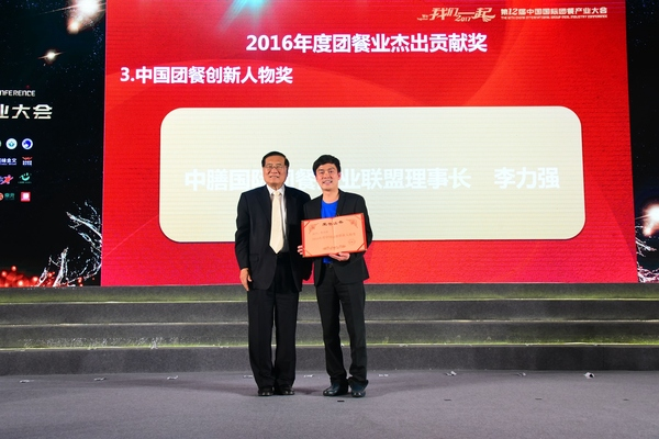 ▲中膳李力強獲得中國團餐產(chǎn)業(yè)人物獎,中國烹飪協(xié)會李亞光副會長頒獎